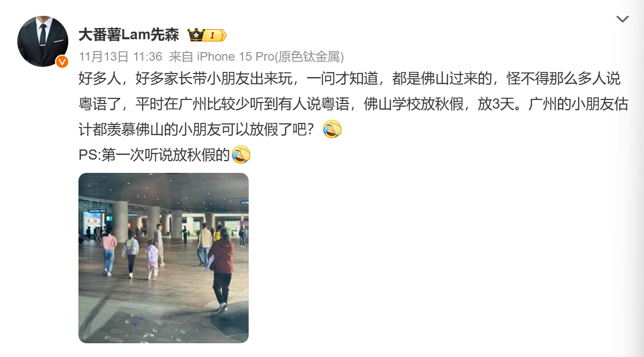 “好多家长带小朋友出来玩,一问才知道,都是佛山过来的,怪不得那么多人说粤语了。”有广东网友在社交平台上发贴称:在湖南长沙遇到了很多第一次放三天秋假出游的广东佛山亲子家庭,让人羡慕。