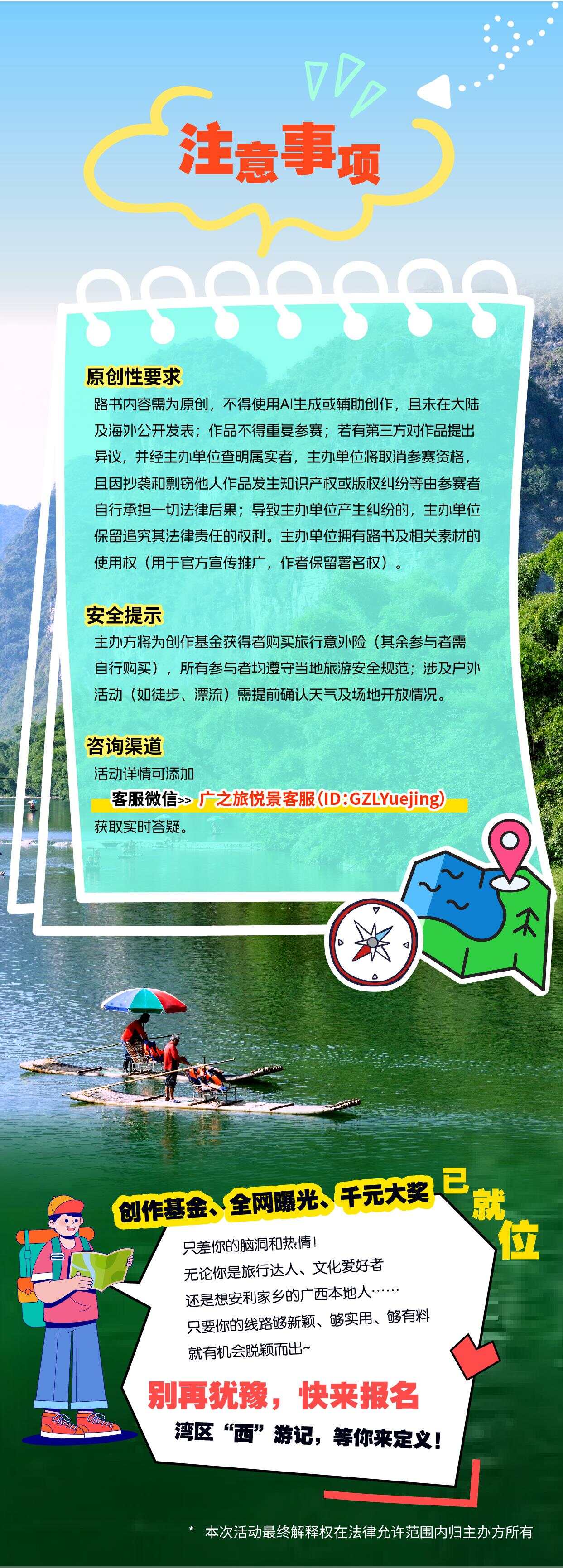 据介绍,参与者可通过“广之旅头条”或“广之旅悦景”微信公众号报名并提交行程方案。主办方将凭创意性、可行性、地域特色契合度三大维度评选入围方案,入围者将获得专项路书创作基金,用于实地体验与内容产出。