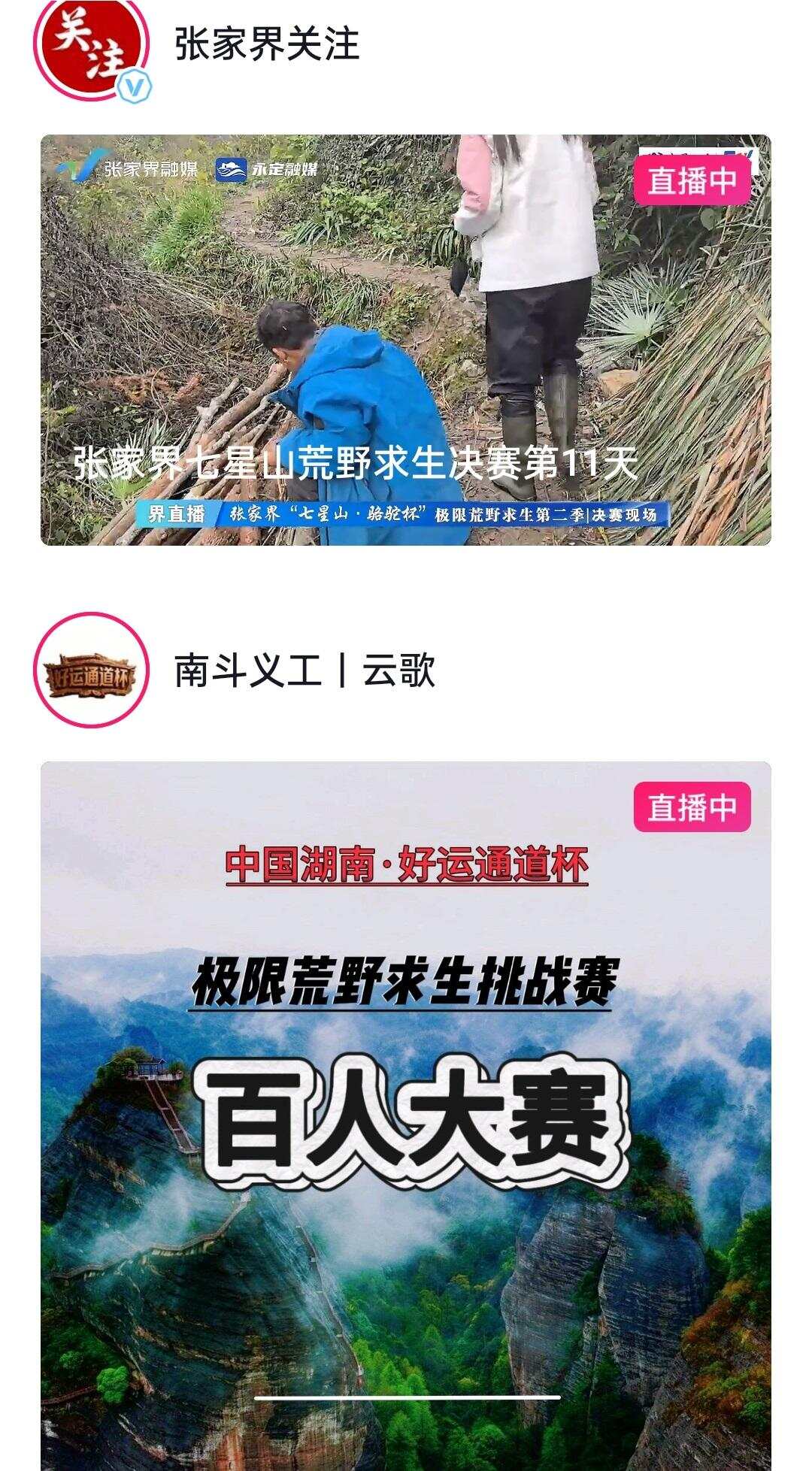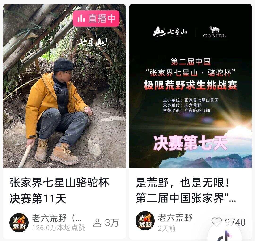 2025年7月15日,张家界七星山景区主办的第一届“七星山杯”挑战赛开幕时,来自全国的参赛选手100名,需依靠主办方提供的初始物资——一把柴刀和一截楠竹,在张家界七星山大绝壁自主生存。到了10月8日,“七星山·骆驼杯”国际极限荒野求生挑战赛第二季拉开帷幕,赛事也吸引近100名参赛选手。
