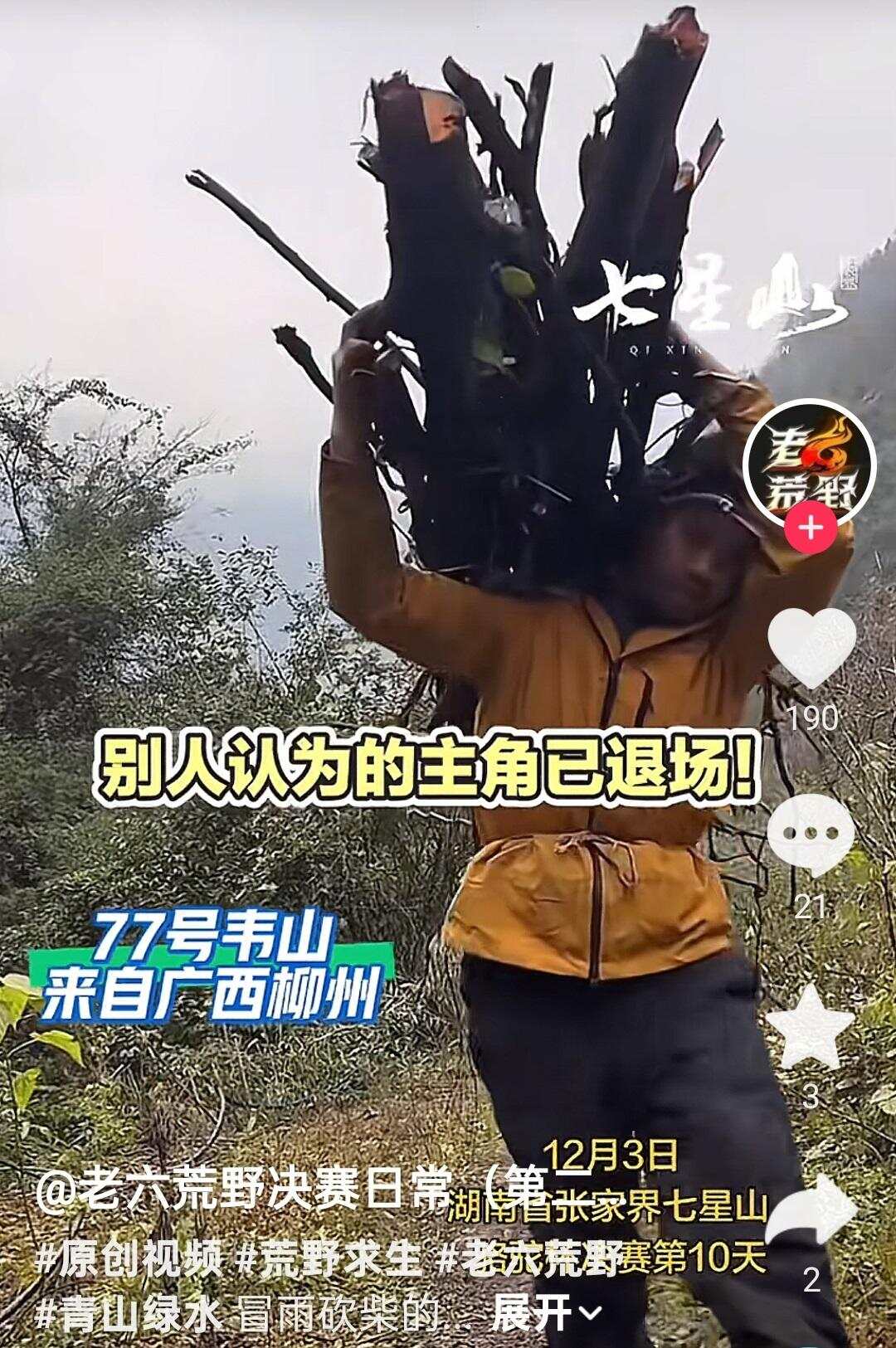 当湖南张家界七星山荒野求生挑战赛决赛来到第10天,人气选手“文车车”和“林北”在12月3日下午的视频直播中,选择了拿2000元奖金退赛,决赛还剩8名选手。12月4日中午1时许,记者在抖音平台上看到,承办方“老六荒野”的决赛第11天直播场次点赞已经突破170万。