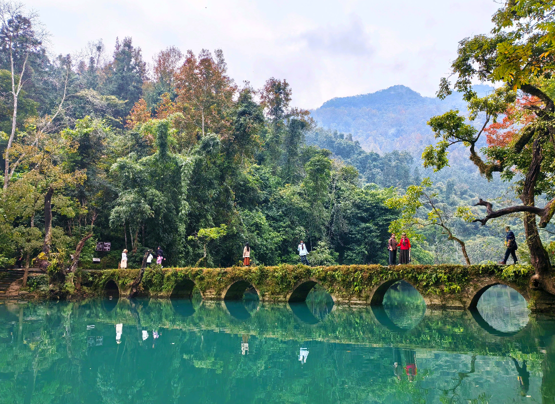 线路中的“小”,指向荔波小七孔。这里仿佛一座巨大的天然盆景,古桥卧波,瀑布叠水,翠谷幽潭,步步成画。