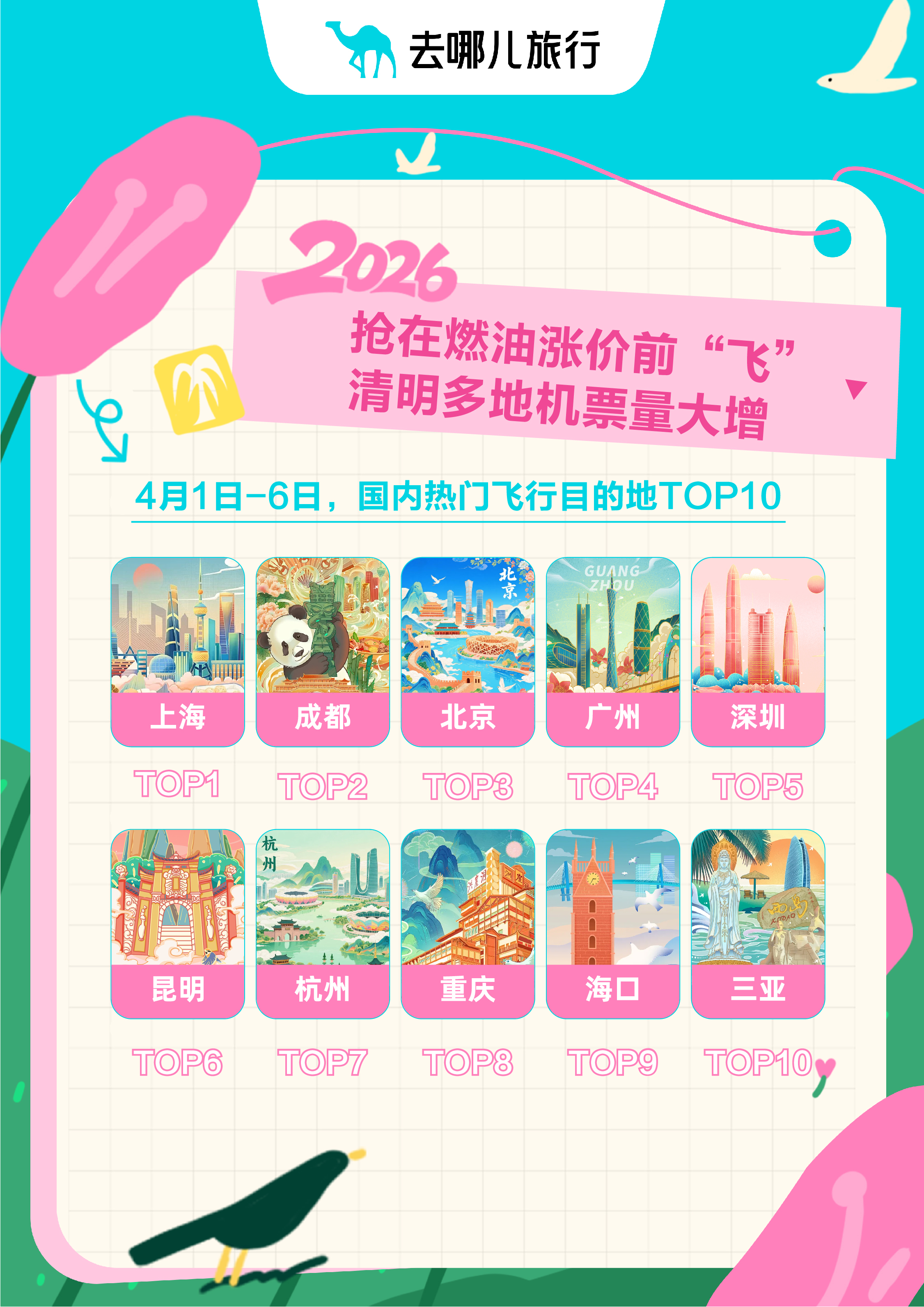 春假与清明的组合,拉长了出游半径。同程旅行方面预计,4月1日-2日旅游市场将迎来第一波出行高峰,800公里以上国内长航段机票预订增速显著,出入境机票搜索热度同比涨幅超50%。