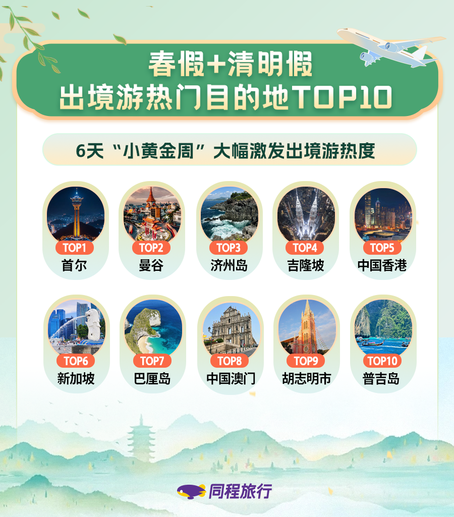 6天长假也为出境游创造了条件。同程旅行数据显示,今年清明假期出境游热度同比增长显著,首尔、曼谷、济州岛、吉隆坡、中国香港、新加坡、巴厘岛等位列出境游热门目的地TOP10。