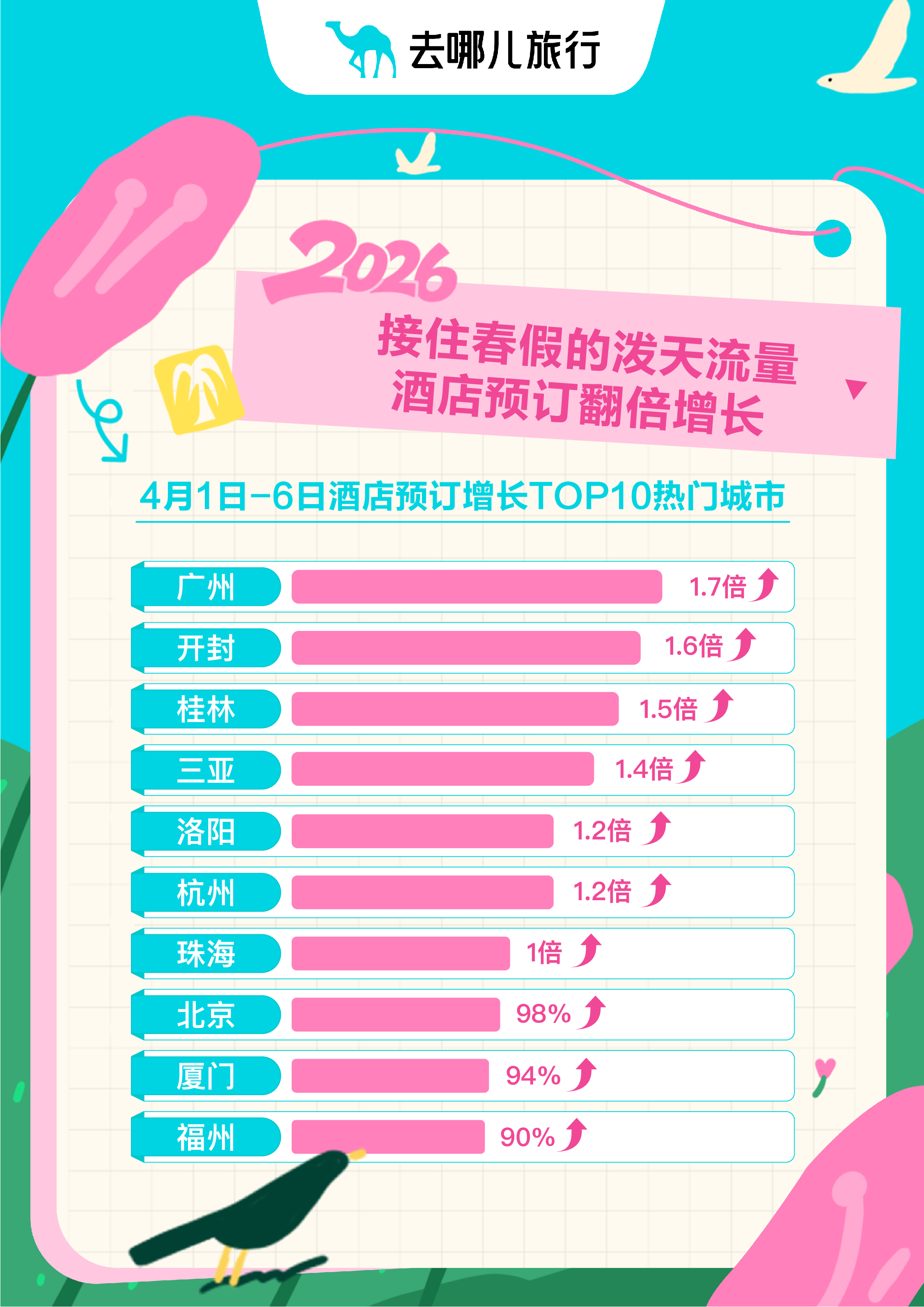 先看“引进来”。航旅纵横大数据显示,清明假期国内热门目的地榜单中,广州、深圳双双跻身前十,其中广州的机票预订量同比增长超60%,增幅位居十大热门目的地前列。广州的酒店预订量也迎来爆发式增长——去哪儿旅行数据显示,4月1日-6日,广州酒店预订量同比激增近1.8倍,增幅领跑一众城市。在同程旅行平台,广州成为江浙旅客“反向出逃”的热门目的地之一,与北京、重庆、西安等传统旅游强市同台竞技。