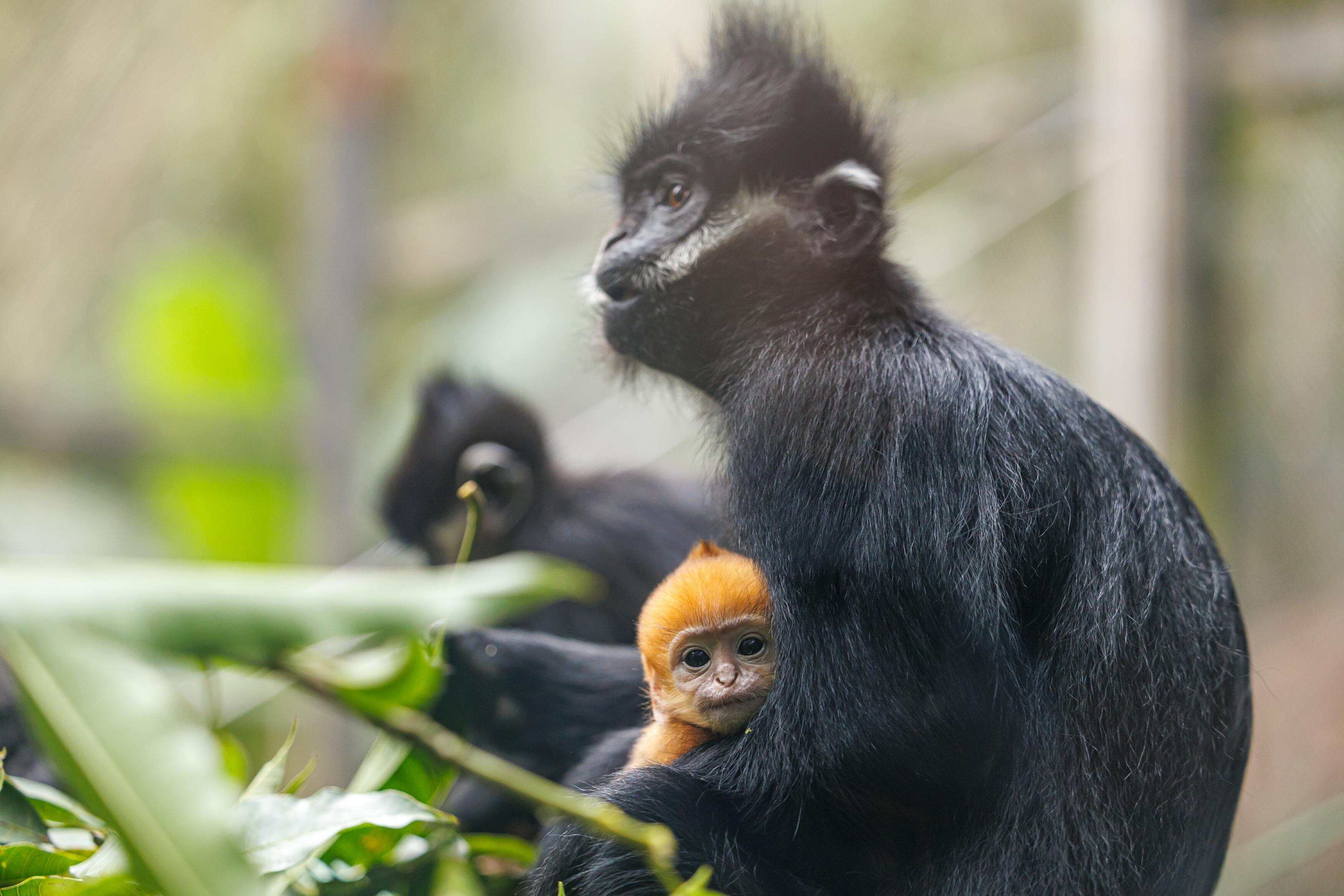 为何母女“肤色”不同?对此,保育员陈香香科普说:“这是黑叶猴成长过程中的正常生理现象。刚出生的黑叶猴幼崽,除个别部位外,全身体毛均为金黄色,大约在6个月后,毛色会逐渐由金黄转为黑色,最终长成和父母一样的成年模样。”