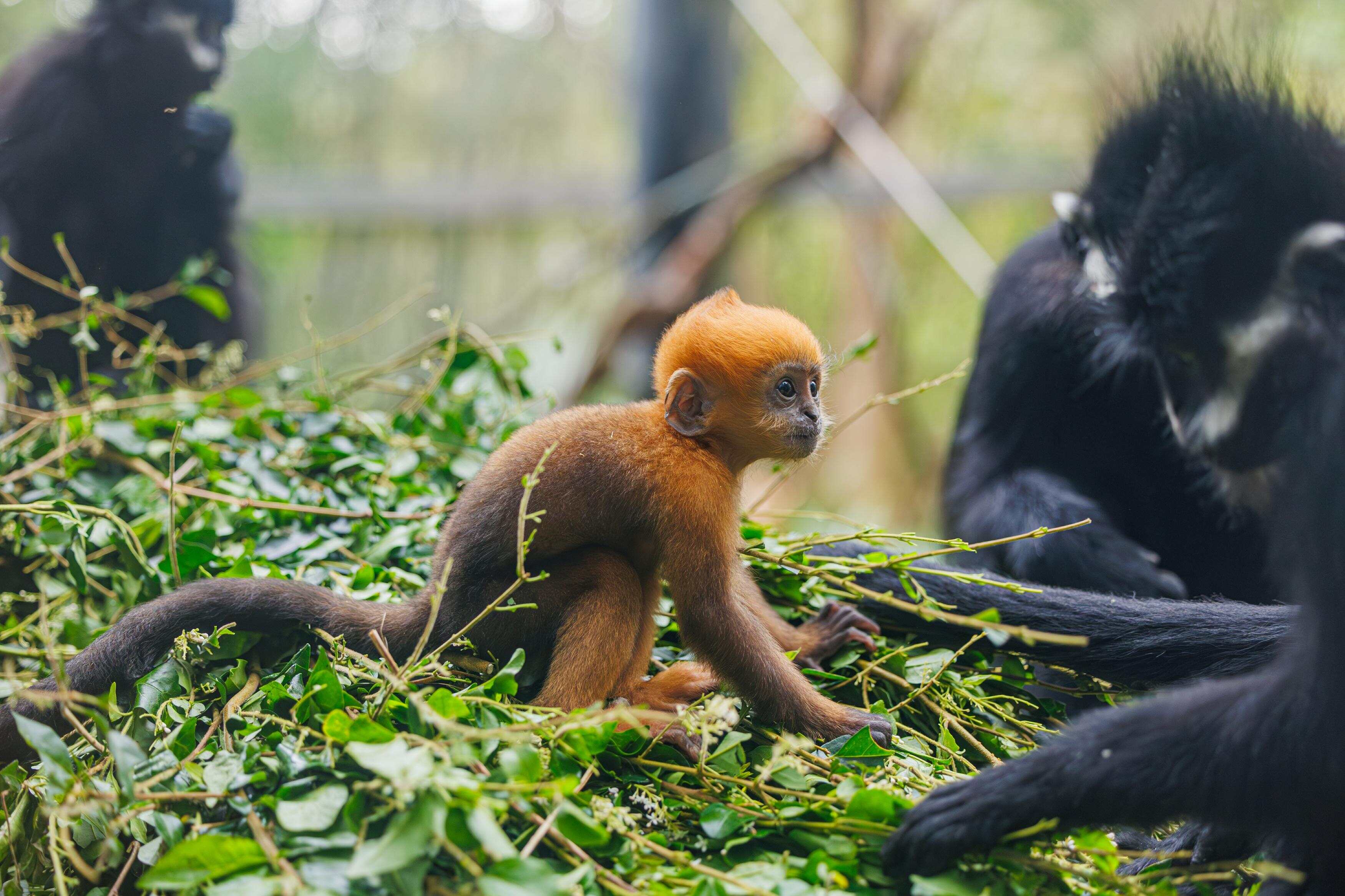 在通体乌黑的黑叶猴群体中,身披金色毛发的“初七”格外显眼,形成了一道独特的风景线。在长隆黑叶猴展区内,刚满月的“初七”始终紧紧依偎在妈妈“笑笑”的怀中,时而探出毛茸茸的小脑袋,用黑亮有神的眼珠好奇地打量着周围的游客与环境,“古灵精怪”的模样,引得过往游客纷纷驻足观赏、拍照留念。